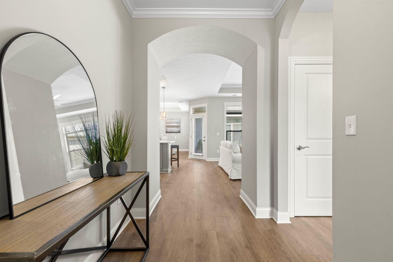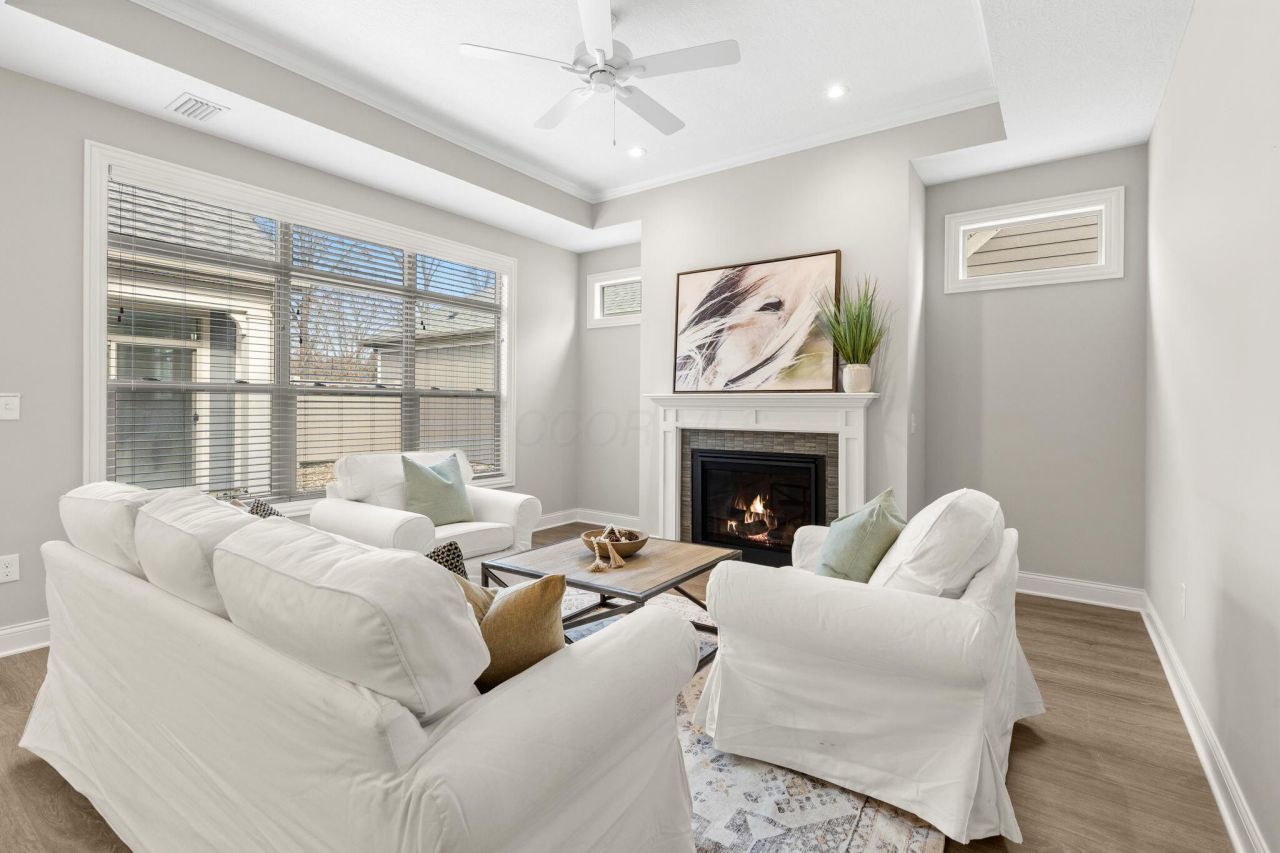 Newly built, move in ready, beautiful Portico ranch patio home located in the desirable Epcon Courtyards at Clear Creek community with Olentangy Schools. Low maintenance carefree living with yard maintenance & snow removal included. Social events hosted at the community clubhouse. Spacious clubhouse offers nicely equipped fitness area and swimming pool! This spacious open floor plan home is the perfect size and has everything you need all on one floor including 2 spacious bedrooms, gourmet kitchen and flex room with french doors that can be used as a home office, media room or 3rd bedroom. Abundant light throughout. Stunning gourmet kitchen features quartz countertops, walk-in pantry, subway tile backsplash, center island with room for seating, gas cooktop, & stainless steel double oven and microwave. 2 car attached spacious garage with abundant room for storage. Covered front porch, and private fenced courtyard patio are perfect for relaxing. Upgraded primary suite includes a bonus area that opens to the courtyard style patio, large en-suite with huge custom walk-in tile shower & gorgeous custom walk-in closet. Additional highlights include a cozy gas fireplace, LVP flooring, transom windows striking coffered ceiling, and 36'' doorway openings. Conveniently located near shopping, Orange Park, library, scenic paths, and bike trails.